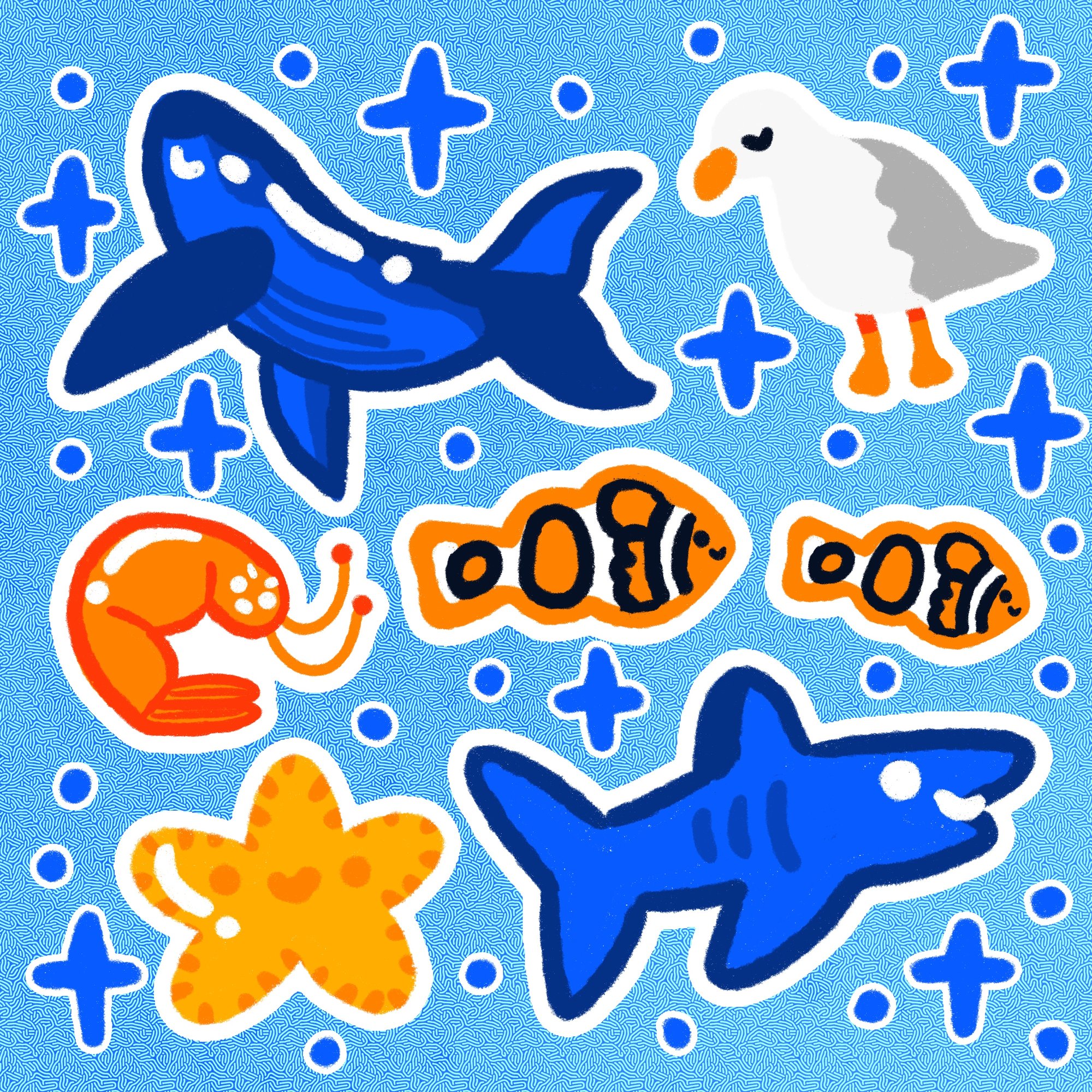 sea creatures sticker sheet! glossy finish, waterproof and 7 vibrant stickers